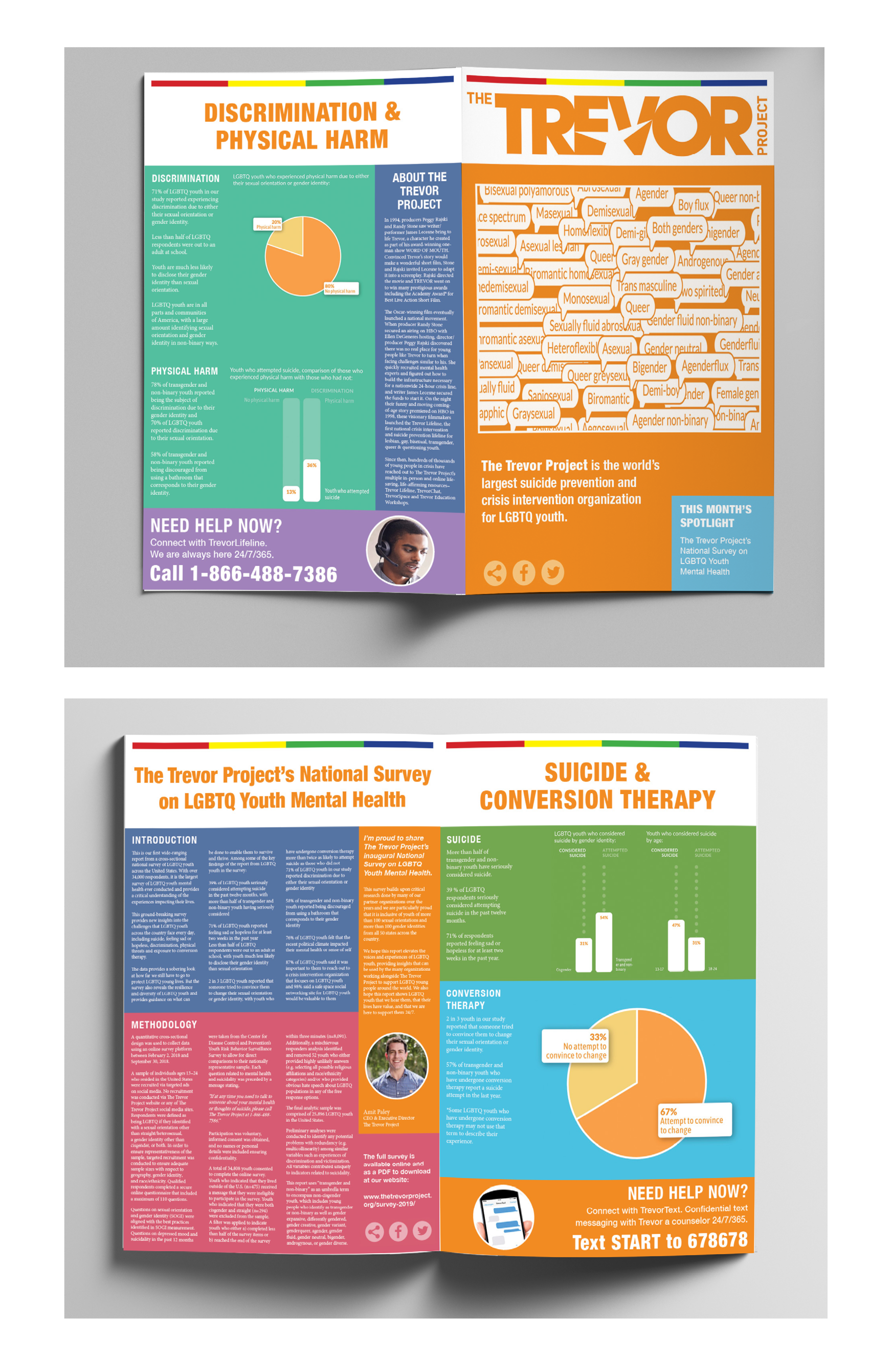 This fictional newsletter was created for The Trevor Project, a non-profit resource for LGBTQ+ youth. I used Adobe InDesign and Photoshop to create the newsletter. All images are from The Trevor Project website.